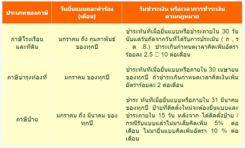 ภาษีโรงเรือนและที่ดิน ความหมายของภาษีโรงเรือนและที่ดิน ถ้าท่านเป็นเจ้าของโรงเรือน หรือสิ่งปลูกสร้างอย่างอื่นโดย 1.ให้เช่า 2. อยู่อาศัยและประกอบกิจการค้าใช้เป็นที่ประกอบการ อุตสาหกรรมประกอบกิจการ 3. ใช้เป็นที่เก็บสินค้า หรือขายสินค้า 4. การอื่นเพื่อหารายได้ให้ญาติ พ่อแม่ หรือเพื่อนอยู่อาศัย สิ่งที่ต้องปฏิบัติ ไปรับแบบพิมพ์ ( ภาษีโรงเรือนและที่ดิน ) ภ . ร . ด .2 เพื่อกรอก รายละเอียดยื่นต่อองค์การบริหารส่วนตำบลที่ท่านอยู่ในเขต 1. ประเภทแห่งทรัพย์สิน ( อาคาร ตึกไม้ โรงเรือน ) 2. ค่ารายปีแห่งทรัพย์สิน ( จำนวนเงินซึ่งทรัพย์สินนั้นสมควรจะให้เช่าในปีหนึ่ง ) 3. ยื่นแบบแสดงรายการเสียภาษีต่อ อบต . ในเดือนกุมภาพันธ์ของทุกปี การเสียเงินเพิ่ม และค่าปรับ ชำระค่าภาษีโรงเรือนและที่ดินภายในกำหนด 30 วัน ถัดจากวันที่ได้รับการแจ้งการประเมิน หากพ้นกำหนดเงินค่าภาษีนั้นเป็นเงินภาษีค้างชำระ ให้เสียภาษีเพิ่มตามกฎหมาย ผู้ใดรู้อยู่แล้วหรือจงใจยื่นความเท็จหรือตอบคำถามด้วยคำอันเป็นเท็จ หรือหลักฐานเท็จมาแสดงเพื่อหลีกเลี่ยงหรือ จัดหาทางให้ผู้อื่นหลีกเลี่ยงการคำนวณค่ารายปีแห่งทรัพย์สินโดยความเท็จ หรือเจตนาละเลยฉ้อโกงด้วยกลอุบาย โดยวิธีการอย่างใดอย่างหนึ่ง ที่จะพยายามหลีกเลี่ยงการคำนวณค่ารายปีแห่งทรัพย์สินของตน ท่านว่าผู้นั้นมีความผิดต้องระวางโทษจำคุกไม่เกิน 6 เดือน หรือปรับไม่เกิน 500 บาท หรือทั้งจำทั้งปรับ ภาษีบำรุงท้องที่ ถ้าท่านเป็นเจ้าของที่ดินท่านมีหน้าที่ดังนี้ ยื่นแบบแสดงรายการเสียภาษีบำรุงท้องที่ ทุกรอบ 4 ปี ( ให้ยื่นภายในเดือนมกราคมของทุกปีแรกที่มีการตีราคาปานกลาง ) บุคคลใดเป็นเจ้าของที่ดินใหม่ หรือที่ดินผู้ใดเปลี่ยนแปลงให้ยื่นแบบแสดงรายการภายใน 10 วันนับ ตั้งแต่วันที่เป็นเจ้าของที่ดินขึ้นใหม่ การชำระภาษีบำรุงท้องที่ ชำระภาษี ภายในเดือนเมษายนของทุกปี หากพ้นกำหนดให้ถือเป็นภาษีบำรุงท้องที่ค้างชำระให้เสียเงินเพิ่มร้อยละ 2 % ต่อเดือนหากปล่อยให้ ที่ดินให้ว่างเปล่าภาษีเพิ่มเป็น 2 เท่า ที่ดินใช้เป็นที่อยู่อาศัย เลี้ยงสัตว์ ประกอบกสิกรรม ให้ลดหย่อน ไม่ต้องเสีย ภาษีบำรุงท้องที่ภายในเนื้อที่ภายในเนื้อที่ 100 ตารางวา บทกำหนดโทษผู้ใดโดยรู้อยู่แล้วหรือโดยจงใจแจ้งข้อความเป็นเท็จ นำพยานหลักฐานเท็จมาแสดงเพื่อหลีกเลี่ยง หรือพยายามเลี่ยงการเสียภาษีบำรุงท้องที่ ต้องระวางโทษจำคุกไม่เกิน 6 เดือนหรือปรับไม่เกิน 2,000 บาทหรือทั้งจำ ทั้งปรับ ภาษีป้าย สิ่งที่ต้องปฏิบัติ ถ้าท่านเป็นเจ้าของป้ายหรือป้ายอยู่ในความครอบคร