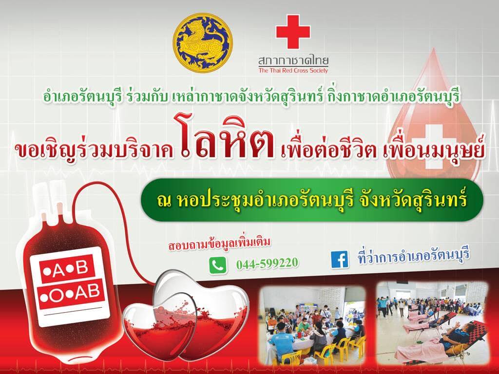ชื่อเรื่อง : ขอเชิญชวนร่วมบริจาคโลหิต หน่วยรับบริจาคโลหิตเคลื่อนที่ โรงพยาบาลสุรินทร์ ร่วมกับ เหล่ากาชาดจังหวัดสุรินทร์ กิ่งกาชาดอำเภอรัตนบุรี หน่วยสาธารณสุข โรงพยาบาลรัตนบุรี