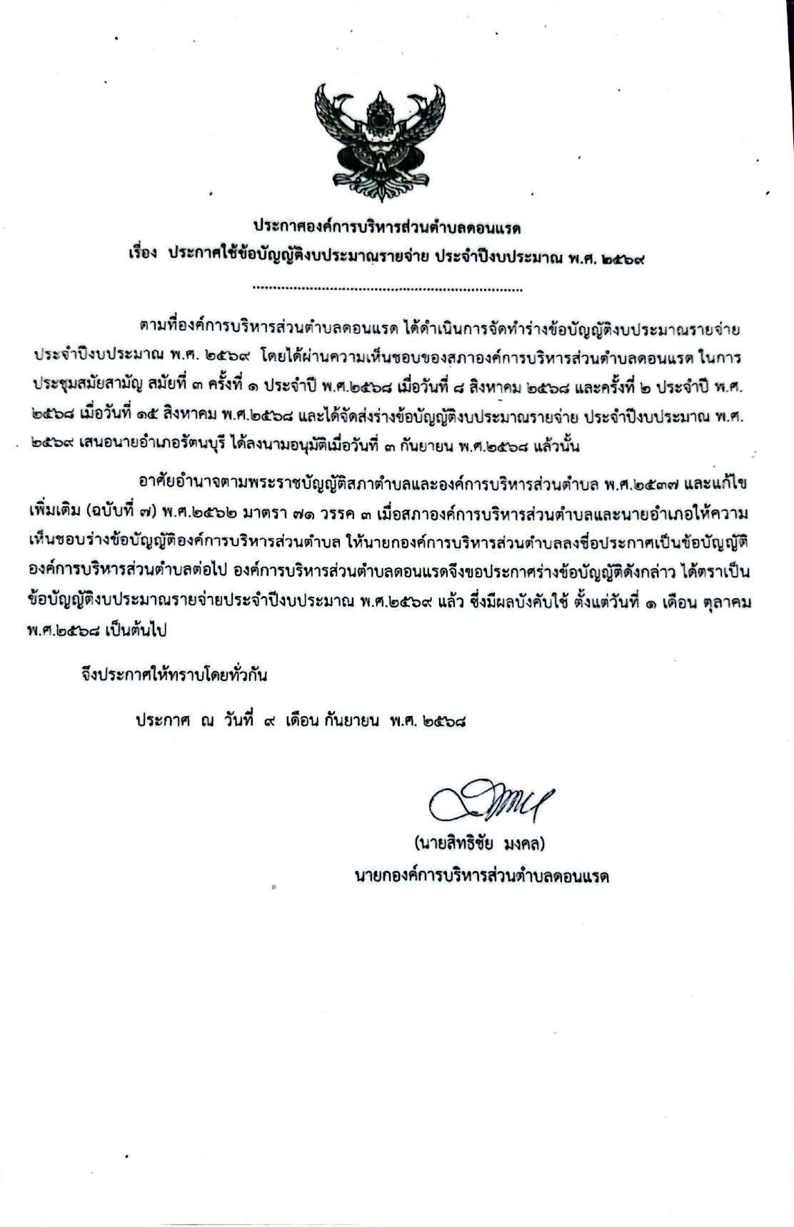 ประกาศองค์การบริหารส่วนตำบลดอนแรด เรื่อง ประกาศใช้ข้อบัญญัติงบประมาณรายจ่าย ประจำปีงบประมาณ พ.ศ.๒๕๖๙